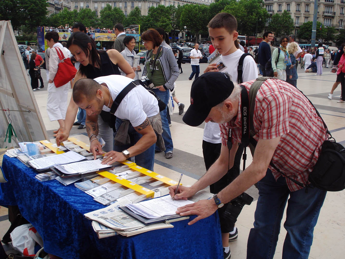 看到如此平静、祥和的修炼功法,人们的脸上流露出对法轮功学员的钦佩,对中共迫害的愤慨和不解,他们纷纷在反迫害征签表上写下了自己的名字。