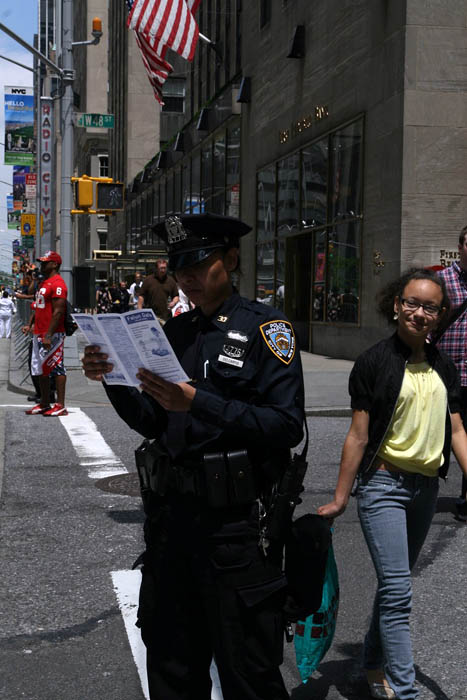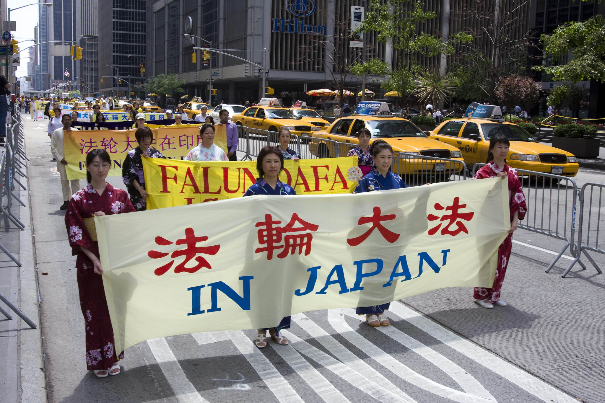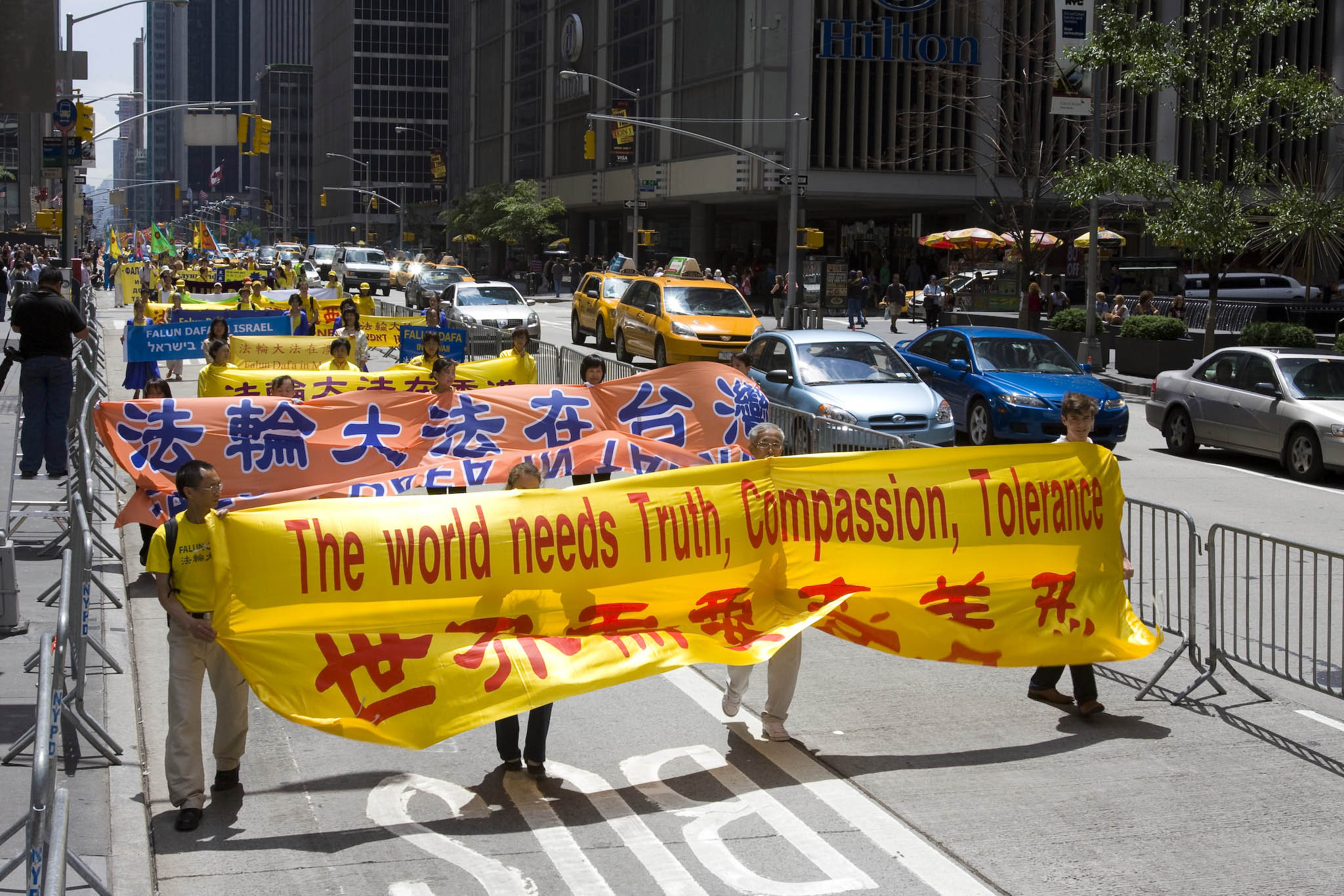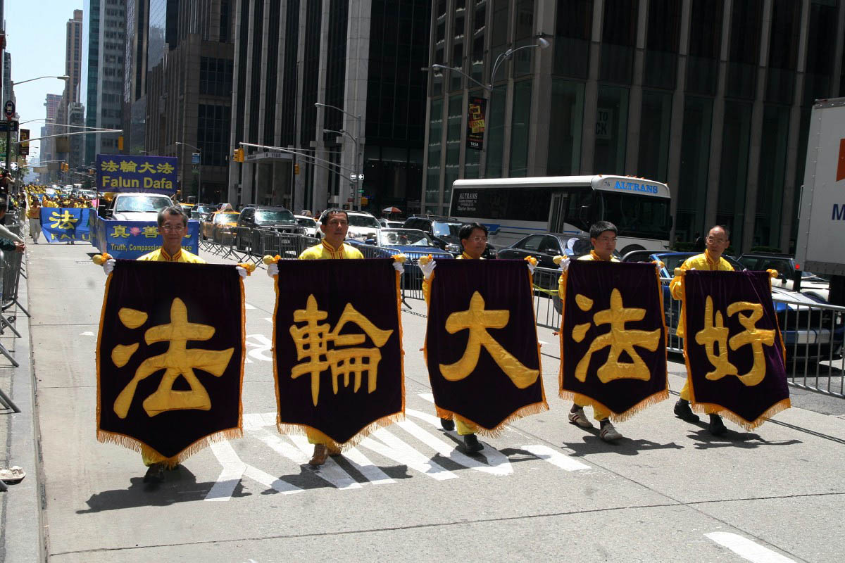 游行的第一方阵上百人的天国乐团开路,一首首《法轮大法好》、《法鼓法号震十方》、《法正乾坤》、《法轮圣王》在曼哈顿的高楼大厦之间回荡着,赢得了路人、司机和商家们的瞩目。来自全球四十多个国家的学员举着美丽庄严“法轮大法在各个国家”的横幅,自豪的告诉世人法轮大法在世界上这么多国家这么多民族洪传,每个人都有机会学法轮功。