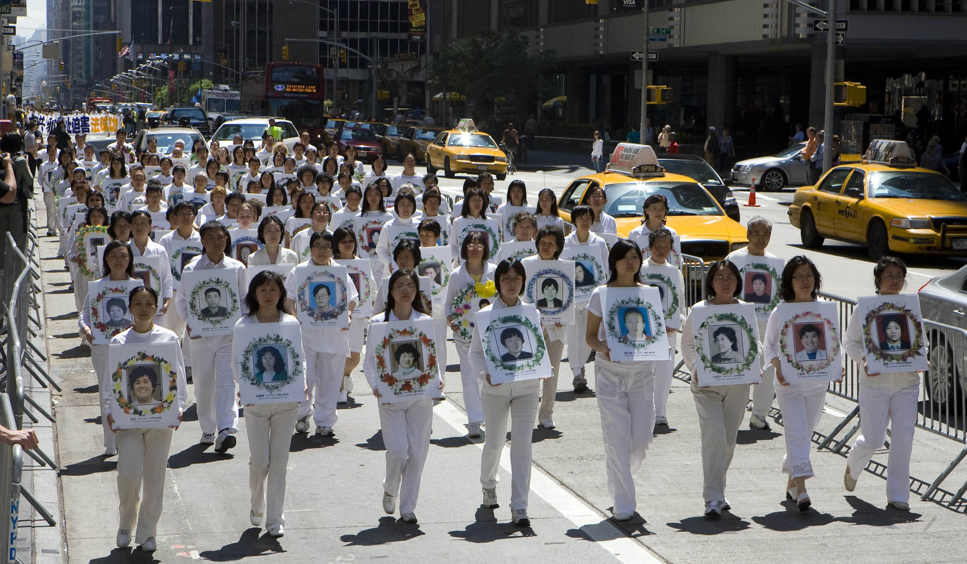数百名大法弟子素衣白鞋,手持被迫害致死的同修图片,缓缓而行。“普度”“济世”的音乐穿越时空,震撼心灵。
