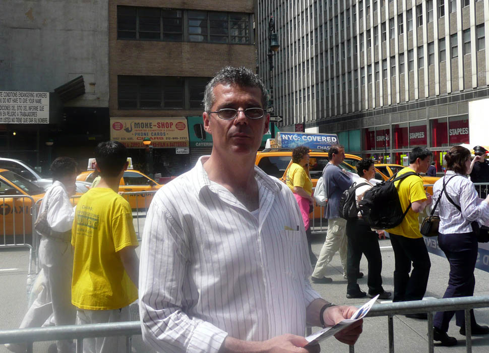泰德•艾文斯(Todd Evans)一直观看着队伍经过至结束。当看到一张张法轮功学员遭受中共酷刑迫害,满身伤痕累累的图片,他惊呆了,他说:“太可怕了,这不是人能做得出来的事。”他知道法轮功在中国受到迫害,但不知道还在继续着。他说,中共政府在做着违法的事情,应该制止它。当他知道法轮功的书籍和功法都可以在网站上免费下载,他很高兴,表示回去后一定要多了解。