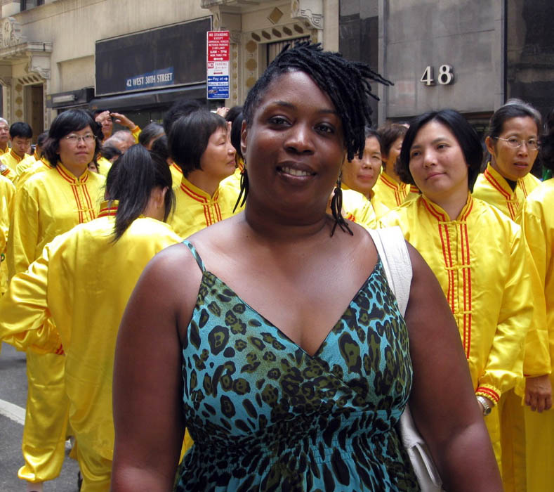 娜塔莎(Natasha)来自美国弗吉尼亚州,以前曾炼过瑜伽,她一直在寻找一种好的修炼方法,观看游行的过程中,她遇到一位也从弗吉尼亚州来的法轮功学员,给她介绍了法轮功。娜塔莎告诉记者,她对法轮功向内找,修炼心性的特点非常感兴趣,打算回去后就开始修炼。今天的活动尤其令她感动的是,这群人所付出的努力都是为了别人,为了那些在中国无辜遭受迫害的人。