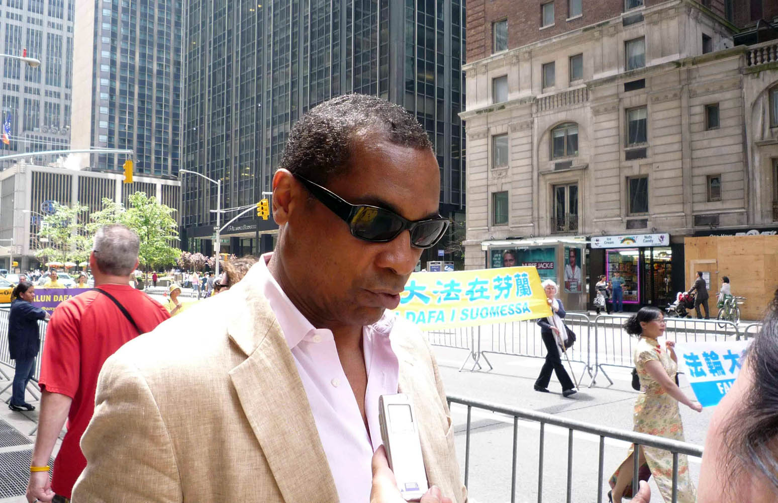 盖瑞•埃文斯(Gary Evans)是纽约市民,他表示以前听说过法轮功,今天早上刚刚有法轮功学员给他讲了法轮功无辜受中共迫害的真相,对他来说这是一件很震惊的事情,他说:“现在我看到了法轮大法的游行,非常平和,让我感到很正的能量。”他还提到,就象二十年前在天安门屠杀一样,中国的人权状况非常糟糕,中共一直在掩盖所有的迫害真相,这是很不应该的。“我很高兴看到法轮功学员这样做,让每一个人都了解到底都发生了什么事。”