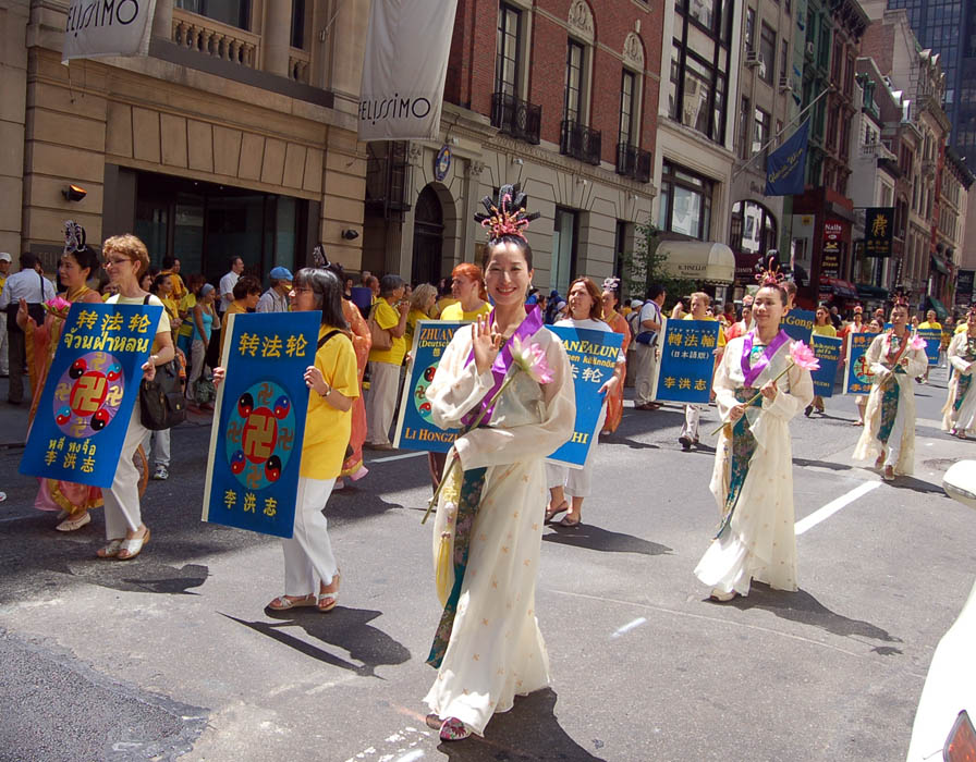 ![]() 游行中扮演仙女的林育霞说:“就是因为中共诋毁法轮功的媒体大量宣传,使我想去看看为什么中共会用这么大密度的舆论来对付一个功法,从此我走入修炼。” |