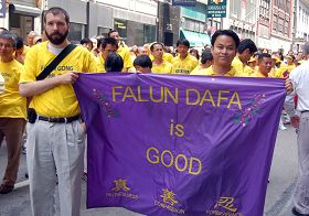 籍洪介绍说,一九九五年她身患胰头癌晚期,被医生判了死刑,在身体状况急剧下降的危险时刻,在朋友的介绍下,九六年在中国开始修炼法轮功,仅仅一、二个月的时间,身体状况急速回升,一年后为了配合法轮功祛病健身的调查而去医院体检,结果是一切指标完全恢复正常。籍洪说:“如果没有炼法轮功,我的生命早就没了。现在大陆法轮功学员还在被迫害,还有那么多人不知道法轮功的真相,我有责任把真相讲给人们,而纽约又是非常重要的地方,所以我每年都来这里参加盛大的游行。”