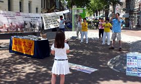 七月四日,荷兰法轮功学员在西部小城古达市举办洪法讲真相活动。