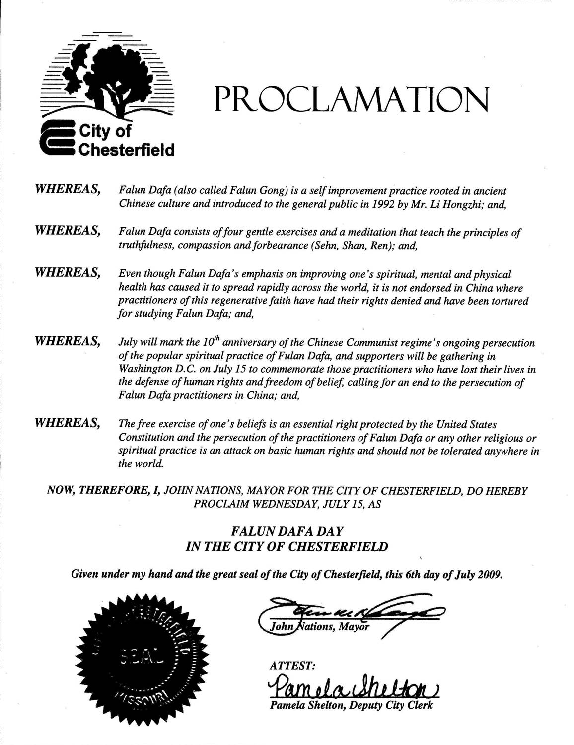 二零零九年七月六日,密苏里州切斯特菲尔德市(Chesterfield)颁发褒奖,宣布二零零九年七月七月十五日为“切斯特菲尔德市市法轮大法日”,因为“七月标志着受欢迎的法轮大法精神运动遭受中共的迫害已长达十年,法轮大法的支持者将于七月十五日齐聚华盛顿DC,纪念为捍卫人权和信仰自由而失去生命的修炼者,并呼吁制止仍在中国发生的对法轮大法学员的迫害。”