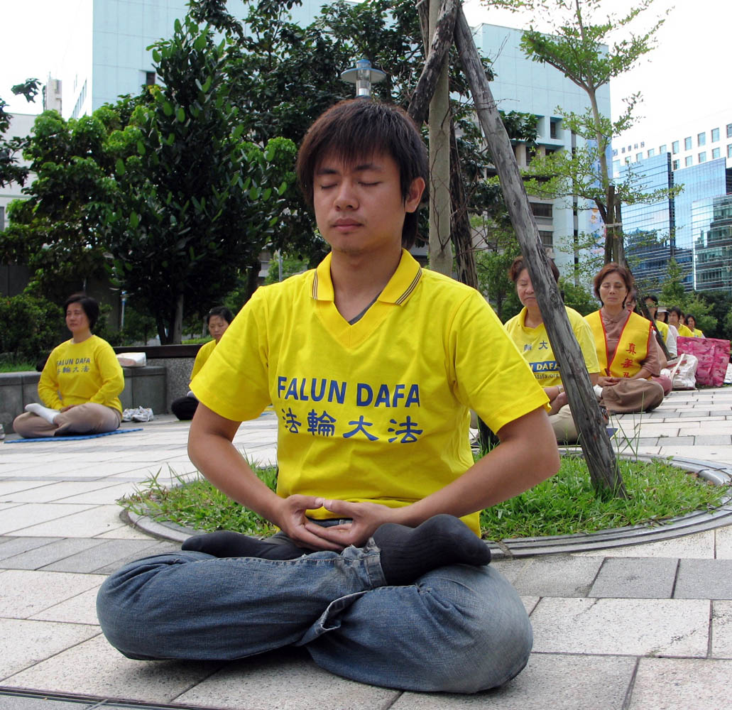![]() 法轮功学员在谴责中共迫害集会后演示功法 |