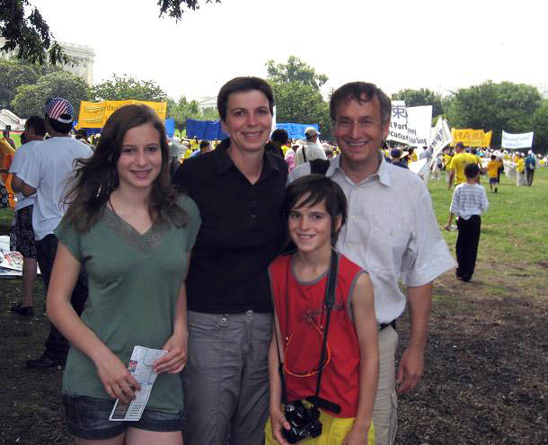 到华盛顿DC度假的拉莫尔医生一家,来自德国莱茵河畔的科隆尼亚。国会山庄前,他们为上千名法轮功学员宁静、祥和的炼功场面所吸引,在一旁久久驻立、观看。当得知如此平和的功法在中国大陆已被迫害长达十年,这些修炼人从世界各地聚集这里就是为了制止这场迫害时,他们感到震惊与不解。