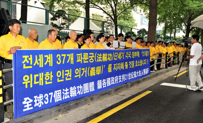 法轮大法学会发言人吴世烈,上午十一点率众举行记者会,并将连署声明转呈总统李明博、国务总理韩升洙、国会议长金炯、大法院长李容勋,以示法轮功学员坚决反抗中共打压的意志。