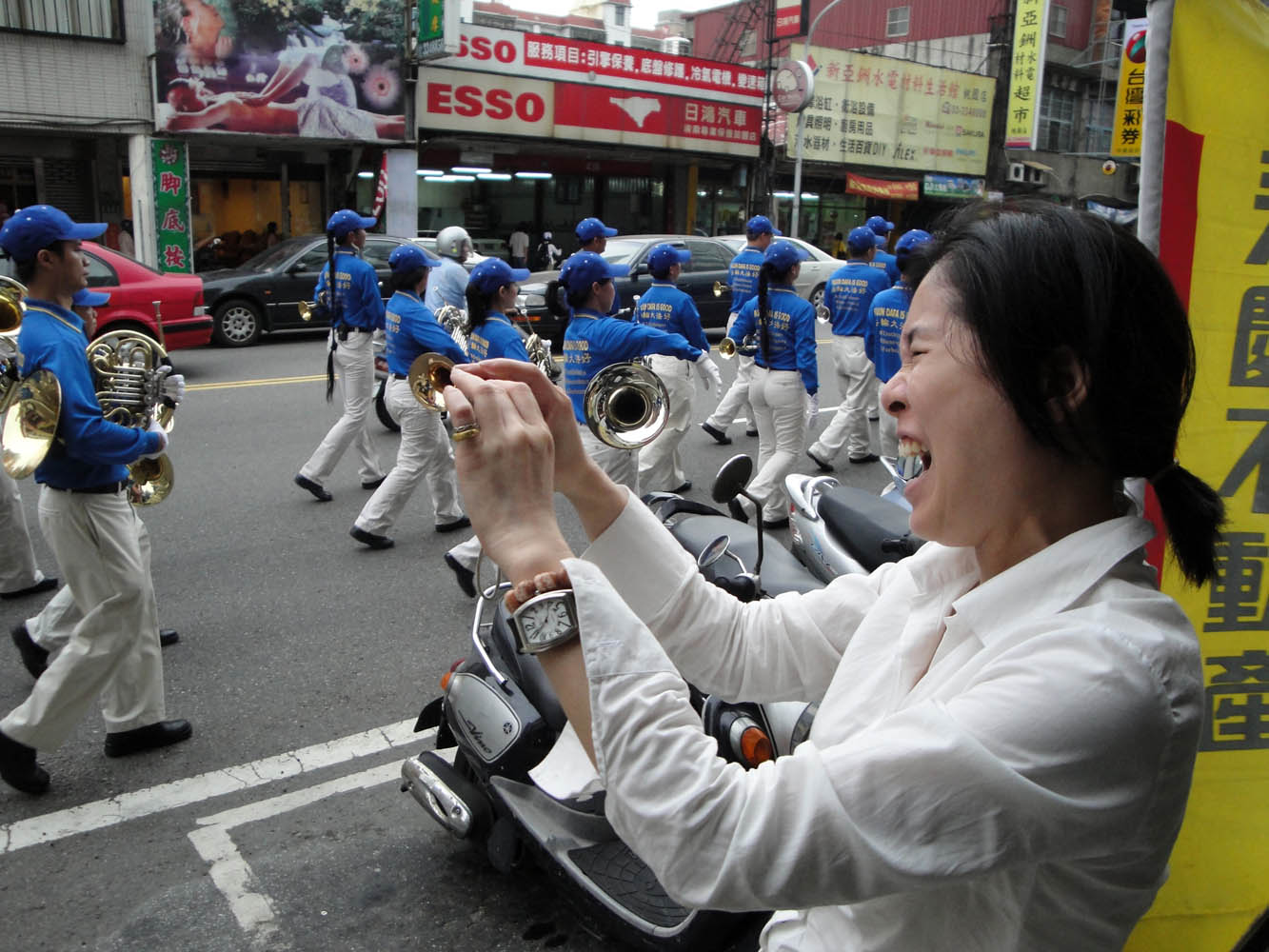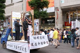 房屋仲介公司陈小姐,看到法轮功游行队伍经过,赶紧跑了出来,对着游行队伍喊:“法轮功加油!”后来又拿出相机拍照,一边兴奋地大喊:“法轮功加油!加油!”