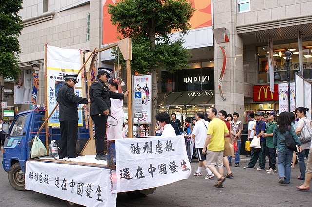 ![]() 揭露中共酷刑迫害法轮功的模拟展示车吸引了人们的关注 |