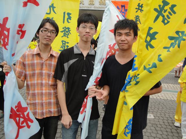 陈同学和倪同学(二兄弟)是邻居。今天三人一同前来参加游行。说起来他们的修炼机缘也是很巧妙的。倪太太因本来身体不太好,容易头晕,但却不知哪里出了问题,后来炼了法轮功,身体就好起来了。后来倪先生和倪家二兄弟就跟着学炼了。因为觉得功法很好,就介绍邻居陈太太来学。就这样陈太太和陈同学也走进大法中来。这三位年轻人现在都上大学了,他们很乐意把这么好的功法告诉给更多的民众,让大家都知道法轮大法好。