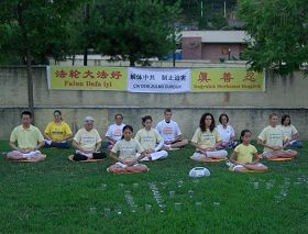 学员们在公园的中心位置悬挂起了“法轮大法好”、“解体中共,制止迫害”和“真善忍”三面大横幅,在悠扬的炼功音乐声中,向人们展示了法轮功舒缓优美的功法。