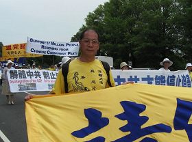 有路人听完法轮功学员的介绍,明白了真相后,主动站到学员的队伍中,手扶着“法办江泽民、罗干、刘京、周永康”的横幅照相留念,以表示他对法轮功学员的支持。