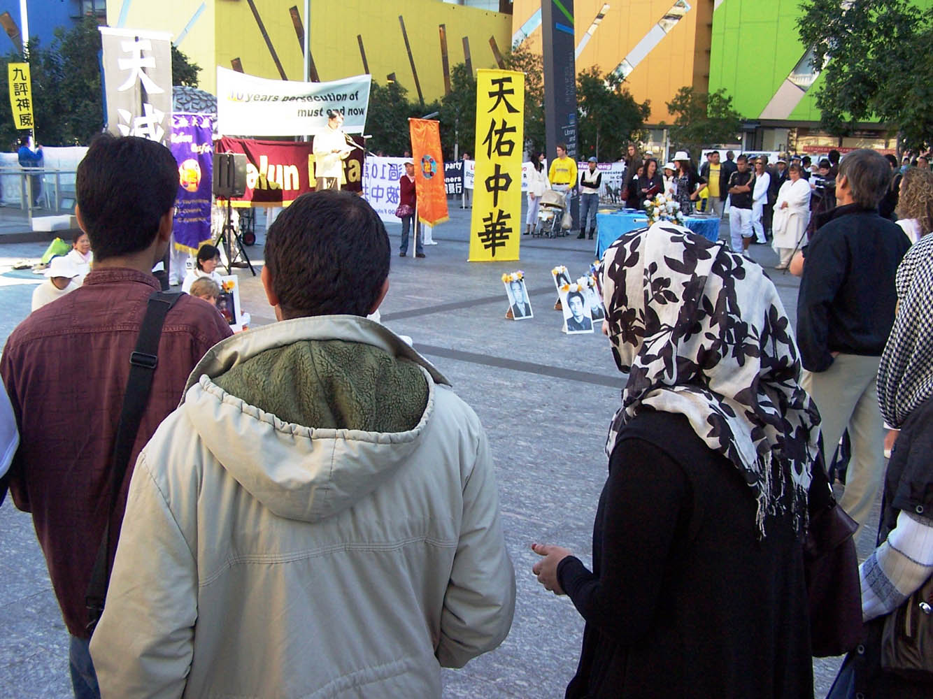 集会现场陈列着被中共迫害致死的部份法轮功学员遗照及真相展版。参加集会的人们拉起一条条横幅,平和地向澳洲人民揭露中共暴行。场面庄严肃穆,吸引众多民众围观。上午十一点,多位嘉宾在集会上发表演讲。