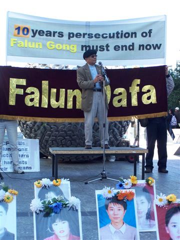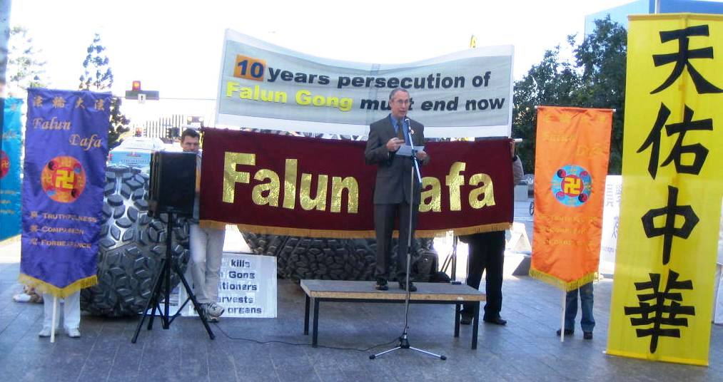 昆士兰法轮大法协会代表安德森(John Andress)首先介绍法轮功及其被迫害的情况,他表示自一九九九年七月二十日起,江泽民因为妒忌而开始镇压法轮功,成千上万的中国法轮功学员开始遭绑架抓捕,送往劳教所,监狱,精神病院被酷刑折磨,性虐待,注射毒针,甚至被活摘器官贩卖后焚尸等。