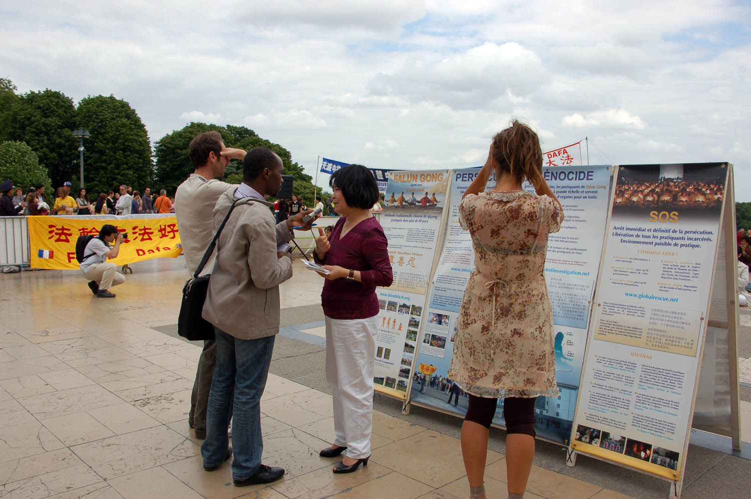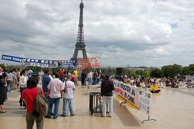 自一九九九年七月二十日中共开始迫害法轮功起,法国的法轮功学员们就在这个世界著名的景点——埃菲尔铁塔下的人权广场上拉起了“法轮大法好”、“停止迫害法轮功”等横幅,向民众讲真相,向法国政府、向来自世界各地的游人讲真相。整整十个年头,无论严寒酷暑都没有动摇法轮功学员的信念:正义必将战胜邪恶,迫害注定失败。