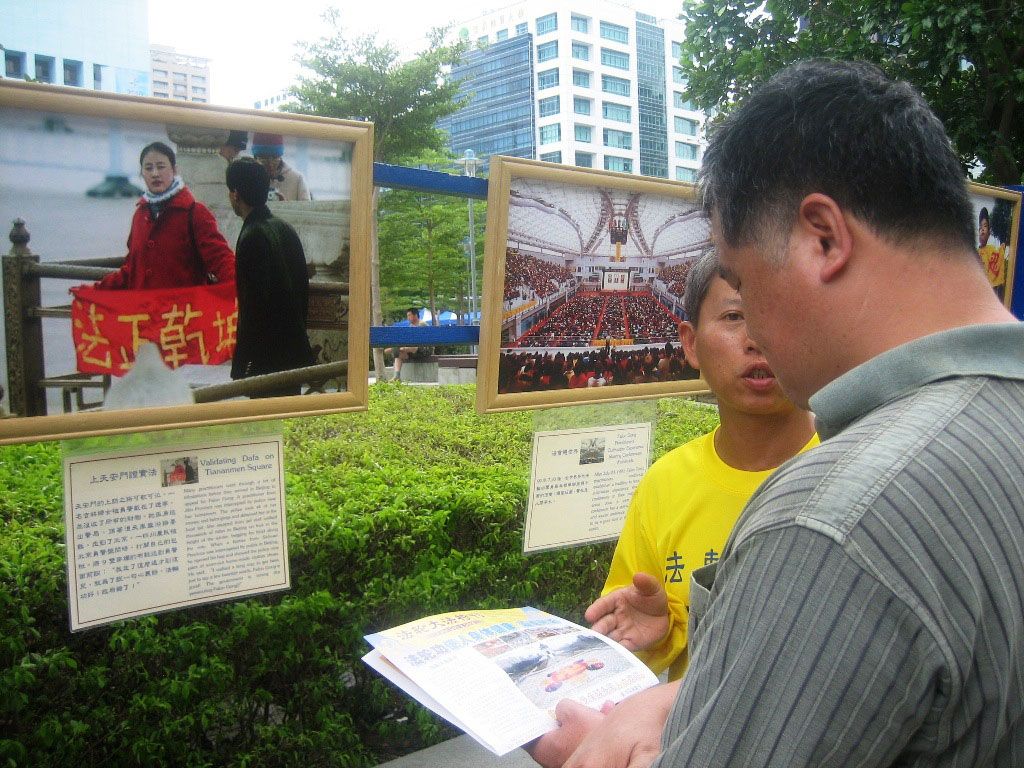 许多在街上观看游行队伍的民众,表达出对法轮功的支持和想学功的兴趣。来自美国波士顿的西方人马克(Mark)是位基督徒,他表示自己已在台湾待了二年,到处都可看到法轮功,在美国也看到,但还是不清楚法轮功是什么。他向学员了解后,随即表示要学功,还询问哪里有炼功点。当他知道大安森林和中正纪念堂都有炼功点后,很高兴地留下学员的名片后离开。