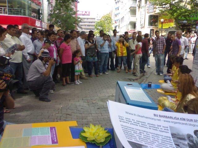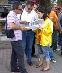 一位回教徒站在路边观看游行队伍,许久不愿离去,他说真想不通中共为何要迫害这么平和善良的法轮功学员呢?学员告诉他,因法轮功学员是以“真善忍”为修炼准则,说真话、办真事,做真人,要慈悲为怀,以大善大忍的精神向世人讲清真相,揭露迫害。而中共却是背道而驰,以假、恶、斗起家,害怕宇宙真理“真善忍”,害怕做坏事曝光,因而迫害修炼人。他明白后对法轮功学员说:“我支持你们!”