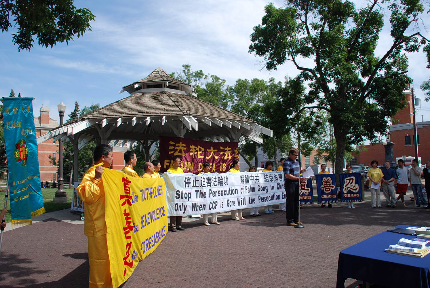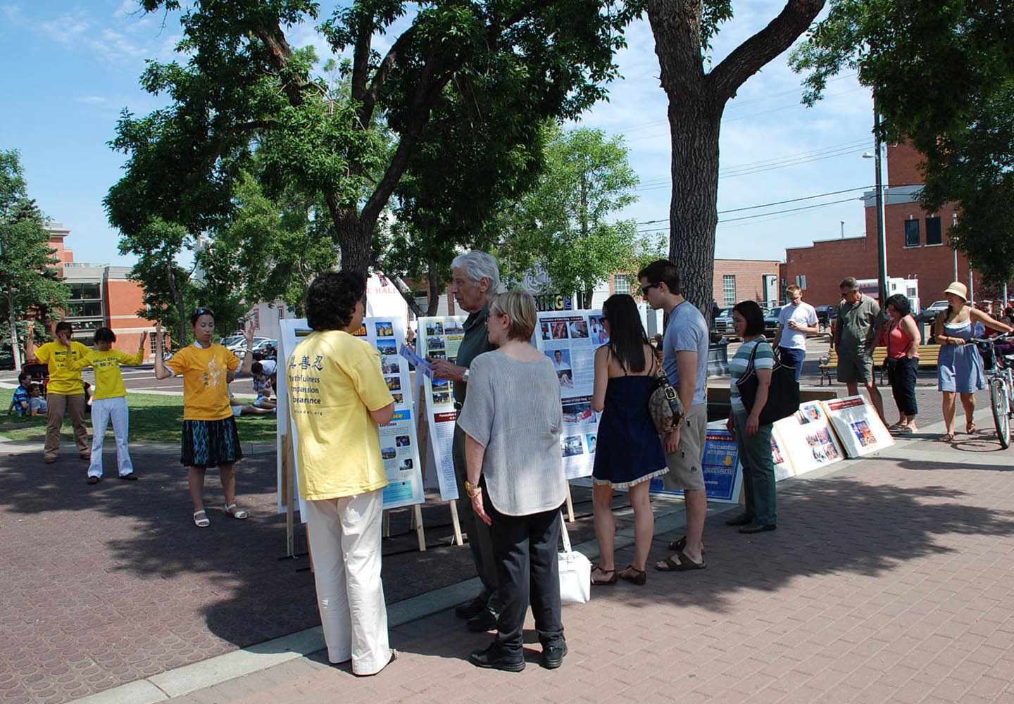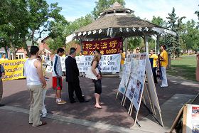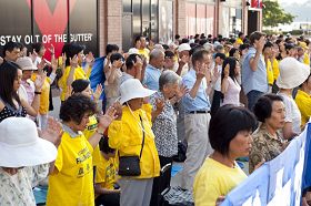 虽然烈日炎炎,法轮功学员宁静祥和的炼功场面吸引了很多过往的游客。在随后举行的集会上,美国不同族裔人士以演奏音乐、表演歌曲或发表演讲的形式,呼吁国际社会关注已持续了十年之久的这场中共针对法轮功的迫害,为中国大陆的法轮功学员争取自由。