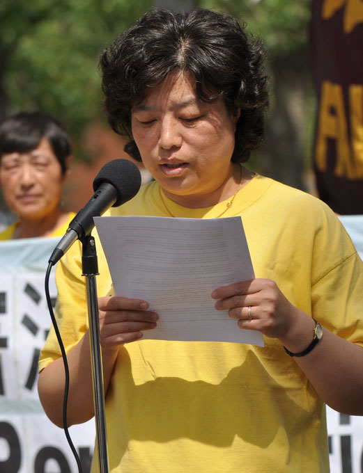 七十一岁的汪太太觉得今天是很重要的日子,她想走出来跟大家说“法轮大法好”。