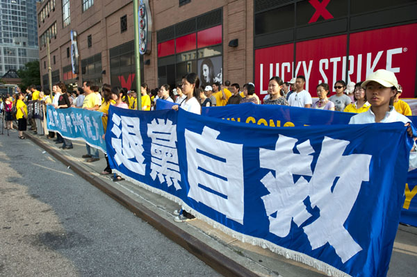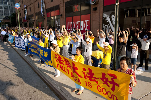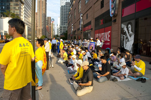 【明慧网二零零九年七月二十一日】(明慧记者采菊纽约报道)二零零九年七月二十日傍晚,反迫害十周年之际,近千名大纽约地区的法轮功学员及支持人士汇集在纽约中领馆前,数名来自中国大陆的法轮功学员以自己受迫害的亲身经历呼吁各界认清中共的邪恶本质,共同制止中共对法轮功学员长达十年的残酷迫害。
