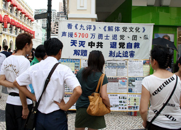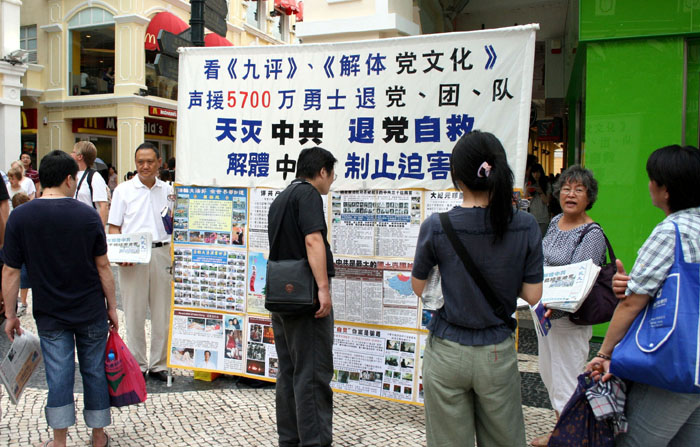 在三个半小时的活动中,澳门学员帮四十多位人士做了三退,并派发了大量的法轮功真相资料,所准备的资料,包括报纸、光碟、《九评共产党》小册子差不多都发完了。