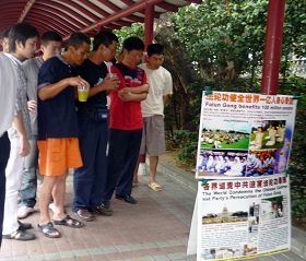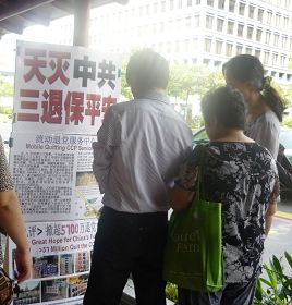 对于少数不明真相的华人,学员们就及时告诉:“隐瞒真相、制造谎言、使很多人不明是非才过分!”不少中国客工在展板前停住脚步,认真地看着,他们都看过《大纪元时报》,有的早就做了“三退”。