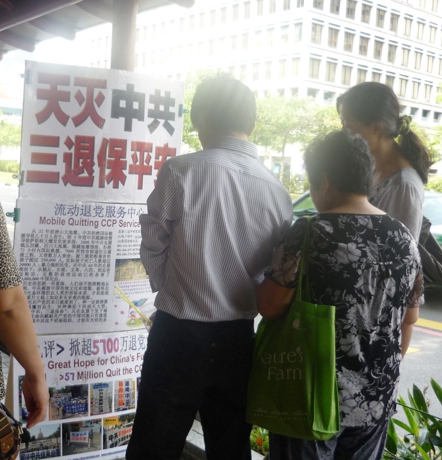 新加坡法轮功学员从一九九九年七月二十日中共迫害后,就挨家挨户的送真相资料,到二零零五年七月,走上街头讲真相;直到今天,每一天都坚持在各地区大街小巷摆真相展板向广大的民众,包括来自大陆数以万计的中国劳工、陪读妈妈、学生、女工等中国同胞讲清真相。