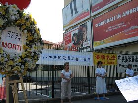 学员们在中领馆前摆放花圈,悼念被迫害致死的同修,并挂起了“中共是迫害法轮功的元凶”、“九评是解体中共的奇书”以及中共动用酷刑迫害法轮功学员的图片等。有一部份学员演示功法。由于中领馆前是来往华人较多的地方,为了方便华人退出中共的组织,学员并在中领馆前挂起“意大利退党服务中心”的牌子,向路人传递“天灭中共,退党自救”的重要讯息。