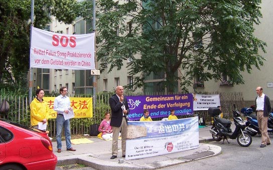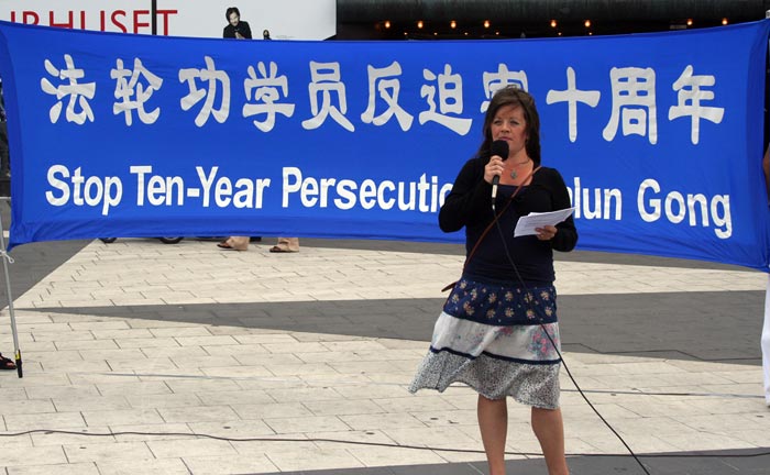 国际大赦奥克兰的负责人玛格丽特·泰勒(Margaret Taylor)在集会中发言说:“今天我们在这里抗议法轮功被迫害十年。中共当局持续迫害基督徒、西藏僧侣、异议人士,而法轮功遭受的迫害是最严重的,很明显的一个例子是去年北京奥运前,数千法轮功弟子被拘捕,送去劳教,遭受折磨。一个典型的被迫害致死的法轮功学员的例子是毕业于北京大学的歌手于宙,于宙去年一月和他的太太许那一起在北京被捕,一个月后他的家人被告知于宙已经在拘留所死亡,给出的原因是疾病死亡,当局还拒绝将尸体交还家人,他的太太许那也被判处三年监禁。”
