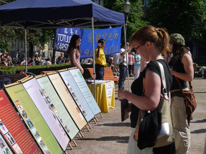 有两个老年妇女过来与学员讨论。其中一人住在赫尔辛基,她已经看到了法轮功学员多次在火车站活动,现在把朋友也带来看法轮功。她的这位朋友住在丹麦,她在那里也看到过法轮功。她们都知道共产党对法轮大法的残酷迫害,她们认为,共产党是“非常不好的,它害怕法轮功学员用自己的脑子去思考 ”。