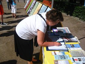 在市中心公园里,享受着夏季假日的游人也是接踵比肩,人们纷纷拿起相机,拍下真相点的横幅,人们在表示对受迫害的法轮功学员的同情之外,还问:到底怎样才能帮助制止这场迫害。他们在反迫害声援书上签名。很多人还详细询问许多关于法轮功的情况。