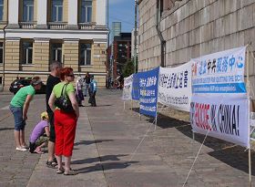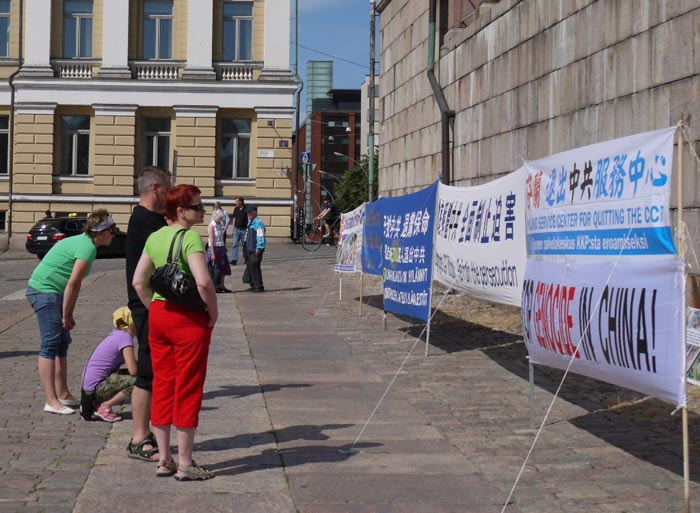 法轮功学员在著名景点赫尔辛基大教堂(简称:白教堂,Helsingin tuomiokikko)前,摆放了真相展板及资料桌,“法轮大法好”、“彻底解体中共 全面停止迫害”等的横幅吸引了人们的目光,很多来自俄罗斯、爱沙尼亚等国的游客一边认真聆听法轮功学员讲述迫害真相,一边将这些真相翻译成母语告知随行的家人。他们赞扬法轮功学员的善良,并祝学员好运。