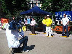 ![]() 学员Olli在向游人介绍法轮功及这场迫害 |