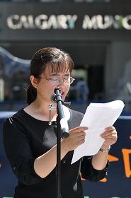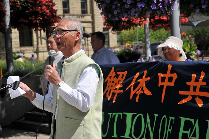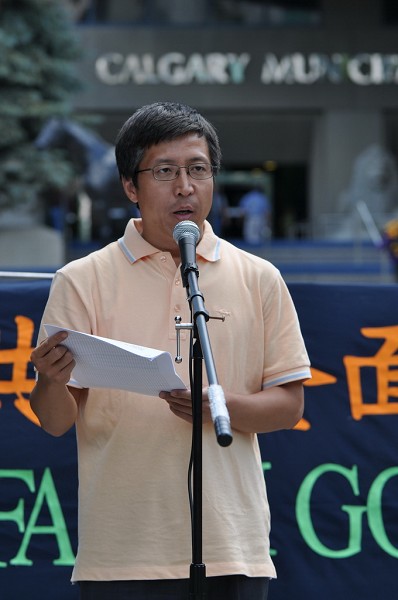 卡尔加里民主促进会主席汤先生在集会上发表演讲,他说:虽然我不修炼法轮功,但是我们崇尚民主、自由和人权,反对酷刑和滥杀无辜。中共的本性就是杀人和制造痛苦,他们没有真正关心过百姓的疾苦。比如众所周知的六四天安门民主运动和最近发生在新疆和西藏的屠杀。
