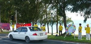 下午两点,为了让当地人也了解发生在中国的迫害真相,学员们在市区最繁华的海滨路口交通灯处拉起横幅,摆放花圈悼念被迫害致死的同修,并给来往车辆派 发真相资料,让更多的当地人了解共产党的邪恶迫害,呼吁更多民众一起制止这场迫害。