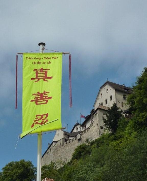 ![]() “法轮大法-真、善、忍”旗帜(背景为列支敦士登皇室住宅) |