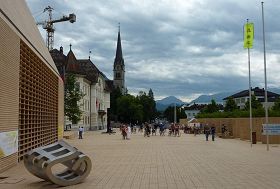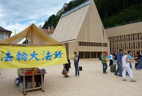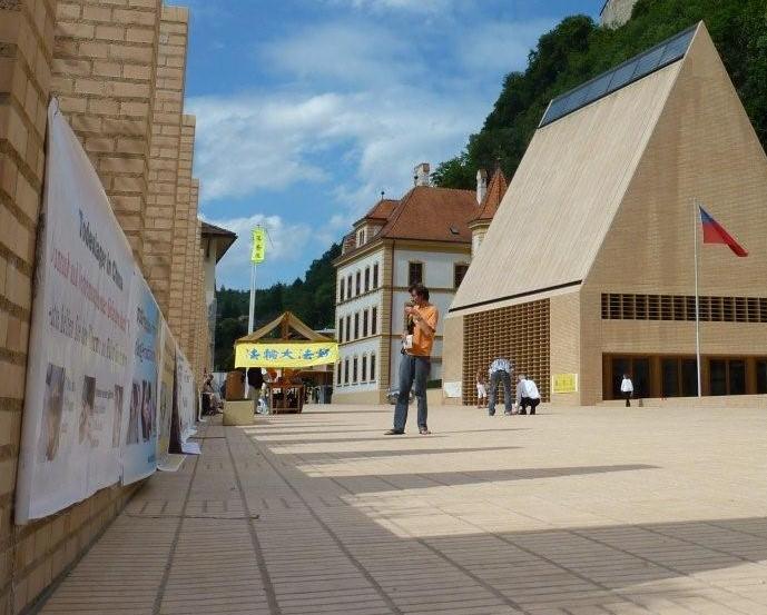 国会和政府的大楼坐落在老城区一个新式风格的广场上,两座大楼联接在一起。这里吸引了许多来自世界各国的游客。整个广场的空间任由法轮功学员摆放、悬挂各种真相资料、横幅等。真相横幅挂满了广场的各个地方,包括国会大楼的墙壁上。由于列支敦士登民众的积极支持,“法轮大法-真、善、忍”旗帜全天都高高悬挂在旗杆上。