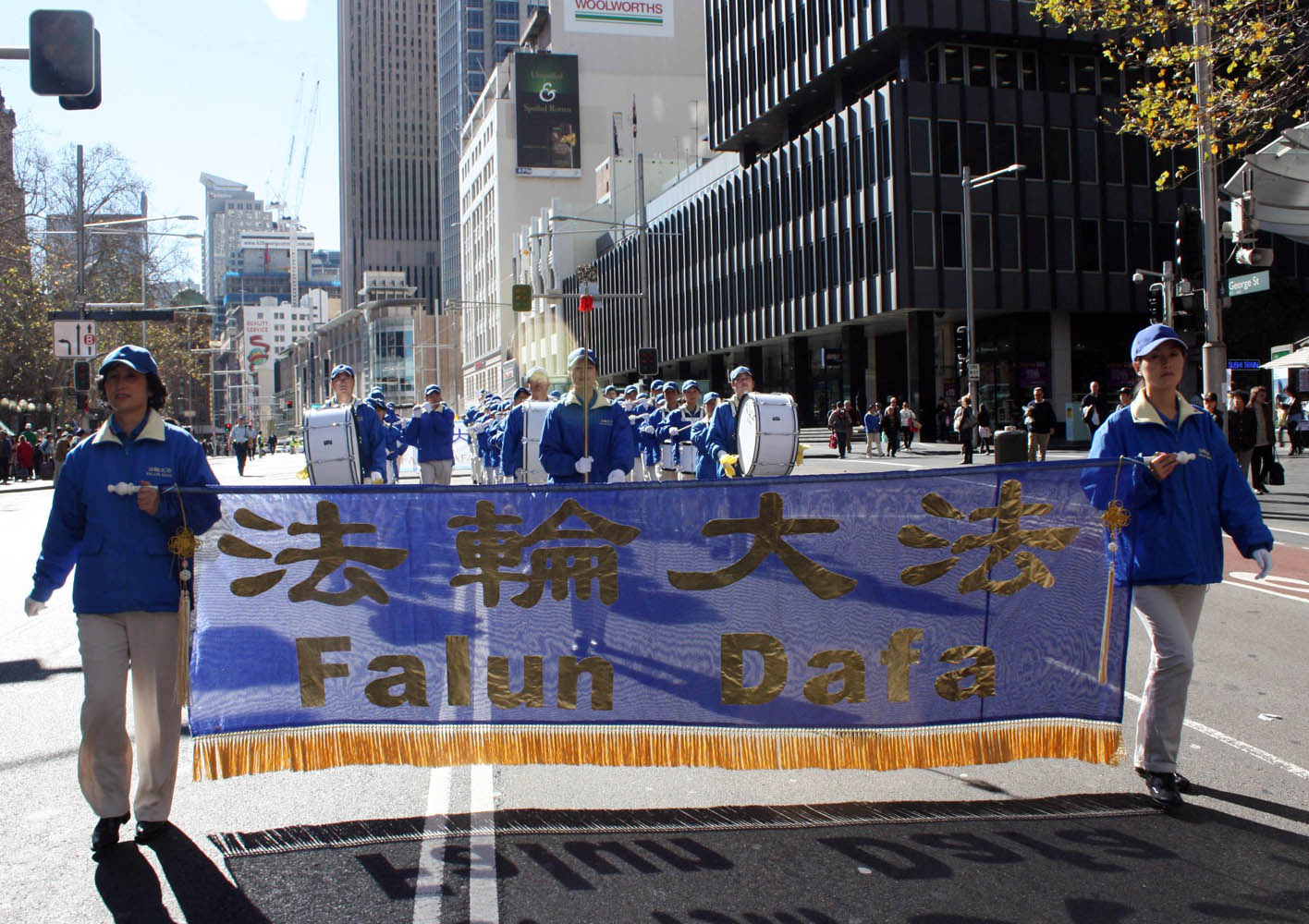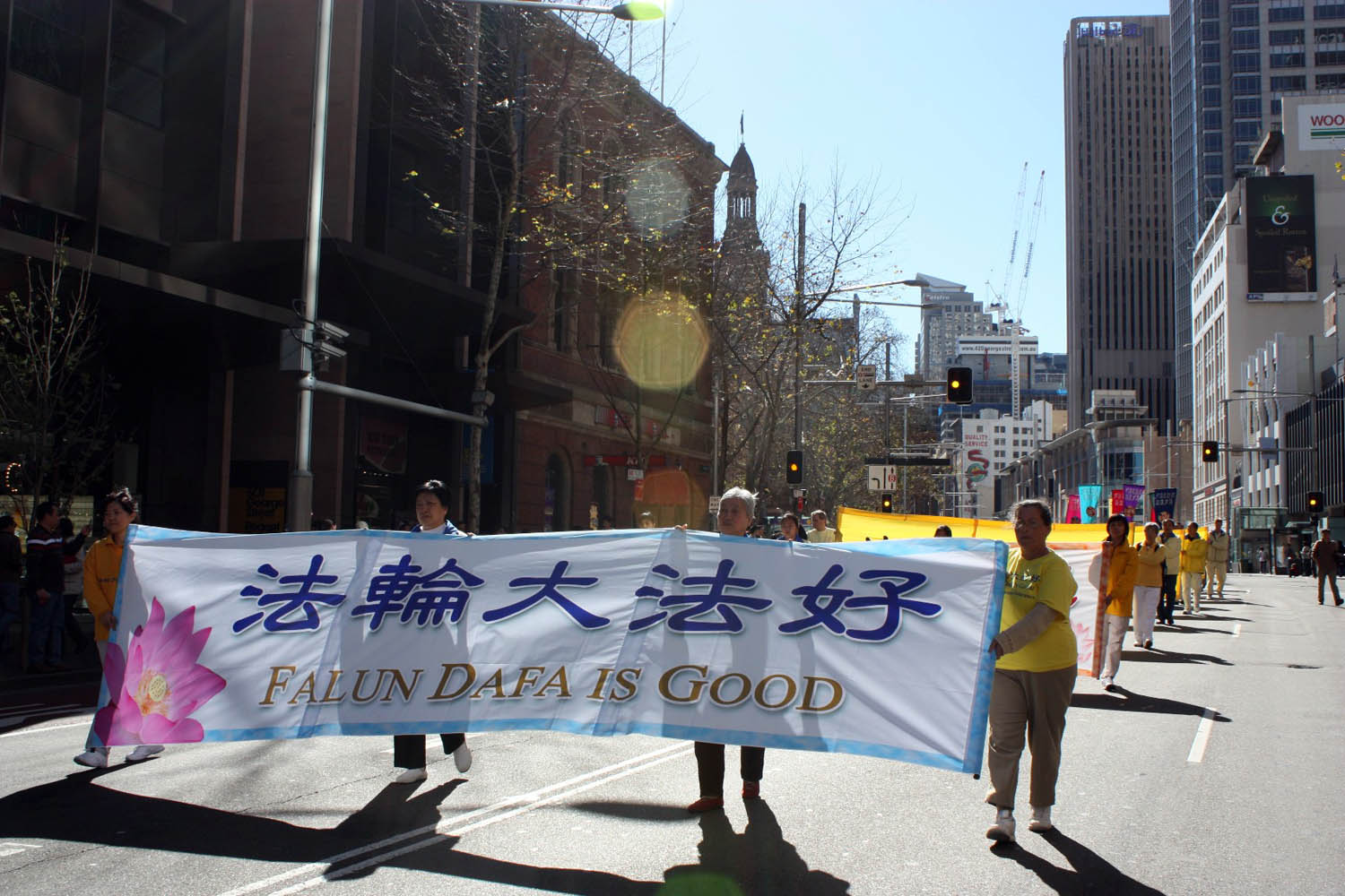 游行队伍从悉尼市政厅出发,以天国乐团开路,由“法轮大法洪传世界”、“和平非暴力反迫害历程”及“九评共产党引发退党大潮”三大部份组成,呼吁善良民众伸出援手,共同结束中共对法轮功的迫害。