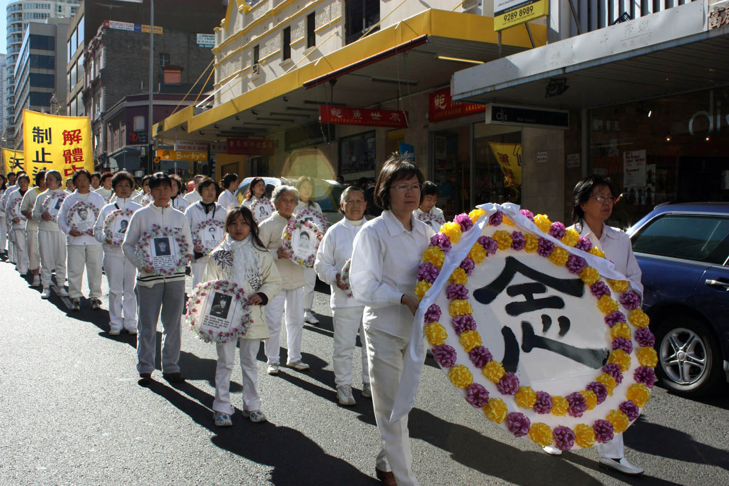 唯一的展车上模拟演示着在中国法轮功修炼者所承受的无名苦难。紧随其后是上百名素衣白鞋学员手持被中共迫害致死的中国大陆同修的照片缓缓而行,肃穆而壮观,告诉着人们这场迫害的惨烈。