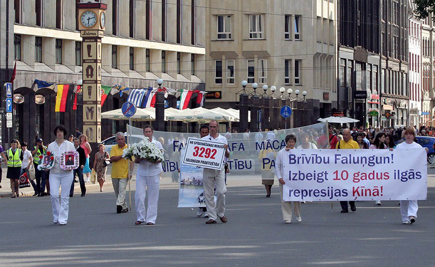 ![]() 法轮功学员在里加市中心游行,抗议中共对法轮功的十年迫害 |
