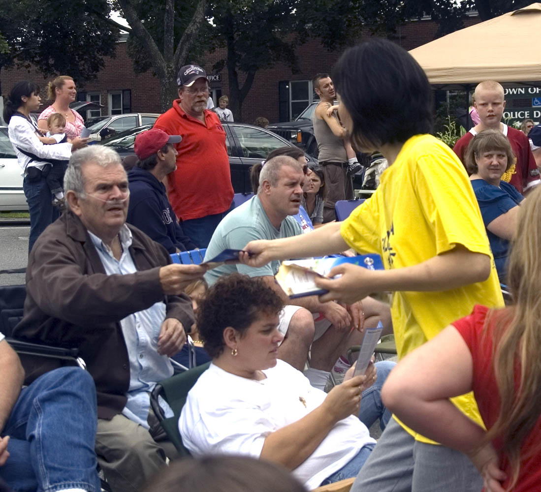 今年法轮功游行方阵包括花车、扇子舞及唐鼓表演。精神抖擞的法轮功学员、震撼人心的鼓声、优美的舞姿加上花车上的功法展示,博得观众热烈的鼓掌。法轮功传单供不应求,许多民众争相接阅,四、五千份传单不到游行结束就全部散发完了。