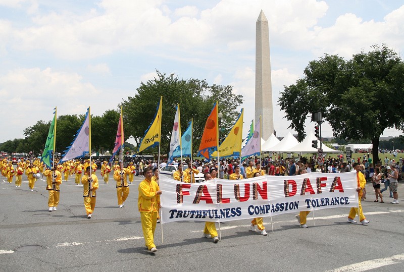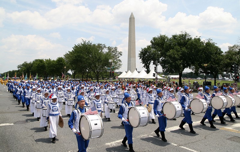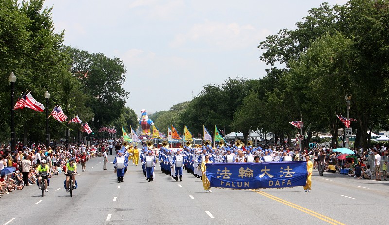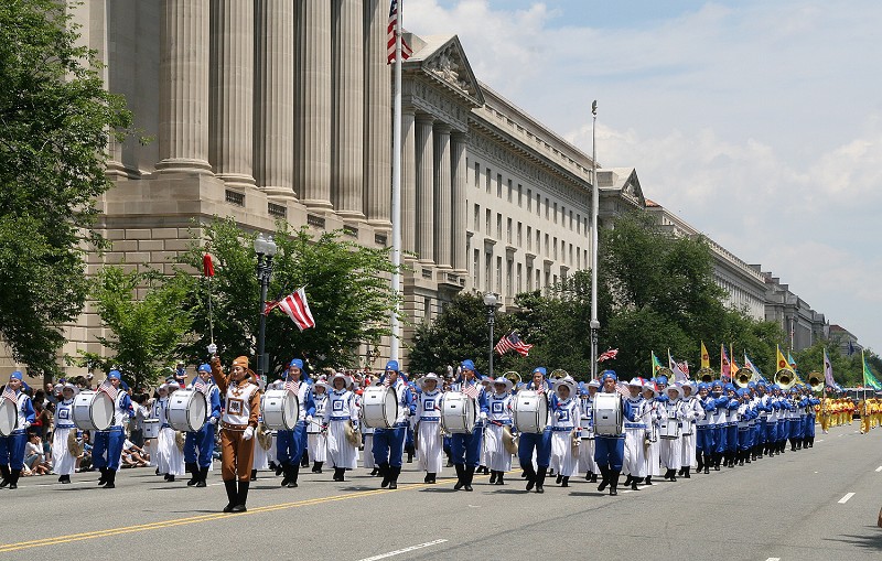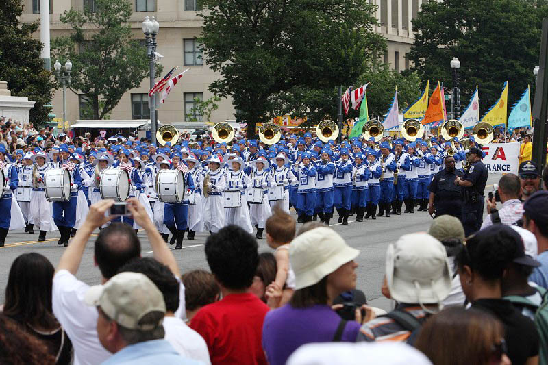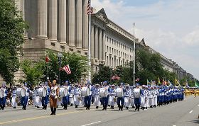 法轮功团体今年第八次应邀参加在宪法大道上举行的美国独立日大游行,其队伍由天国乐团、旗队和腰鼓队组成,是所有参加游行的团体中规模最大的,其中天国乐团一百五十名成员身着清新亮丽的服饰再次在华盛顿亮相,将《法轮大法好》、《法正乾坤》、《法鼓法号震十方》、《法轮圣王下世来》、《美丽的美利坚》五首乐曲带给观看游行的数万观众,成为今年华盛顿国庆游行的一大亮点。宪法大道沿途观看游行的各族裔民众惊叹不已,拍手叫好,第一次见到天国乐团的观众们更是兴奋不已,纷纷询问天国乐团来自哪里。