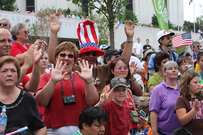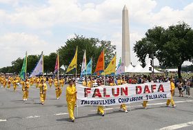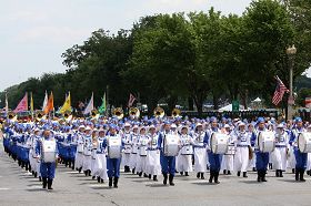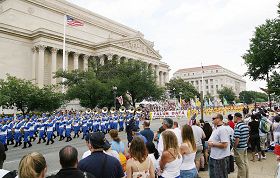 ![]() 2009年7月4日,法轮功团体第八次应邀参加美国首都独立日大游行,由天国乐团、旗队和腰鼓队组成,是所有参加游行的团体中规模最大的。 |
