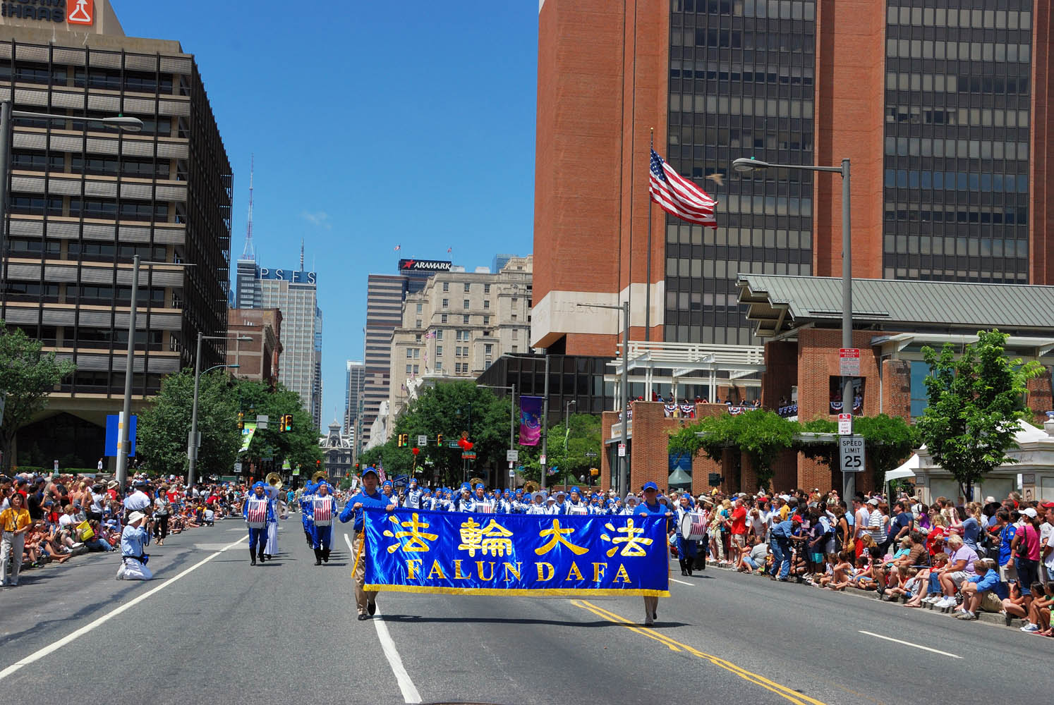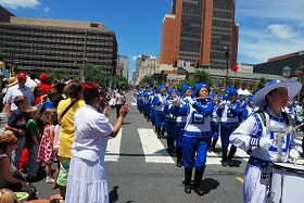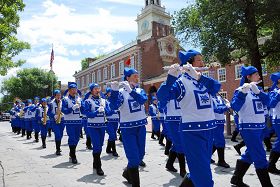 ![]() 参加美国诞生地费城庆祝美国二百三十三岁生日的法轮功天国乐团走在市场(Market)街上,背后是市政府大楼 |