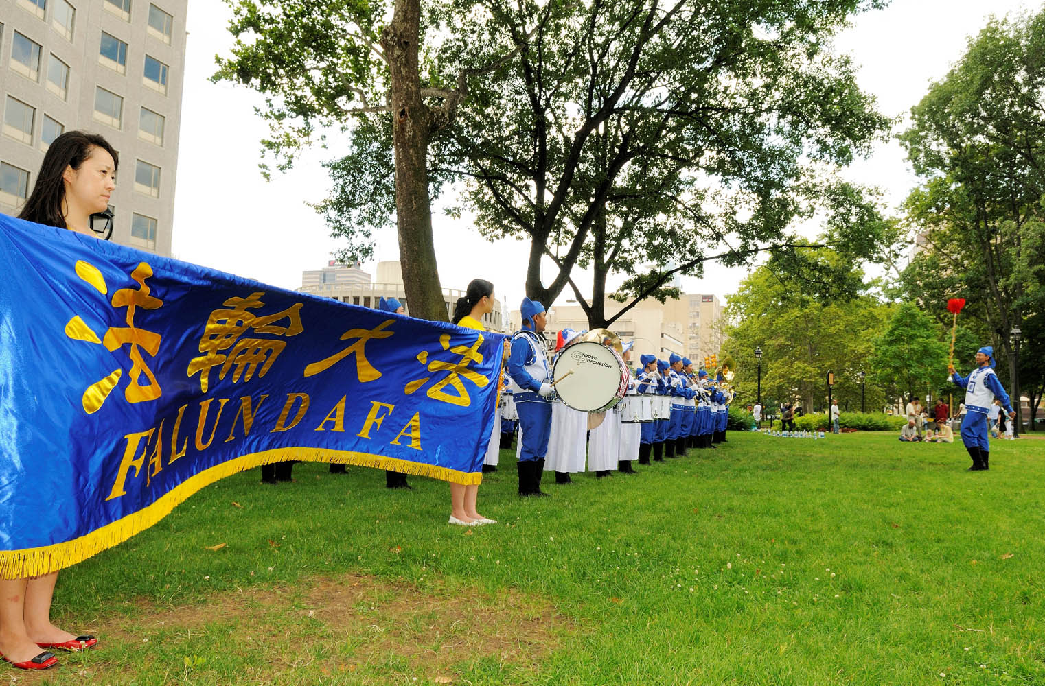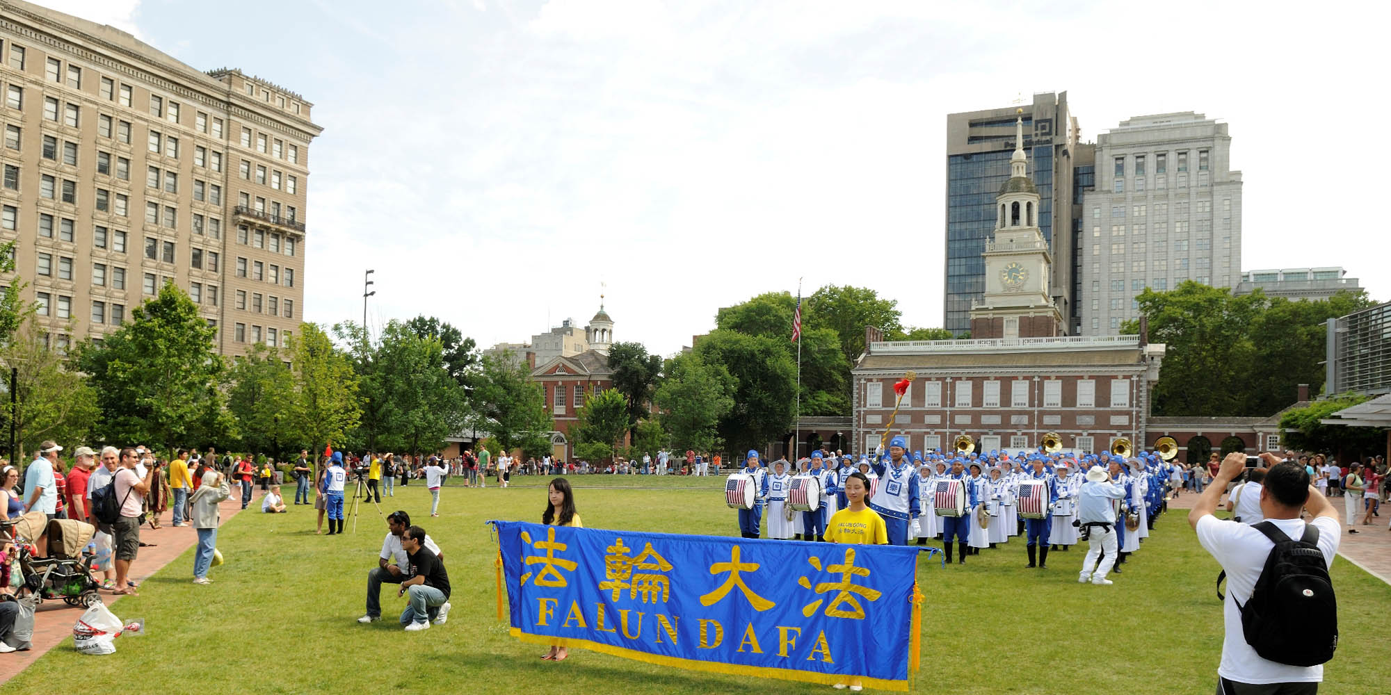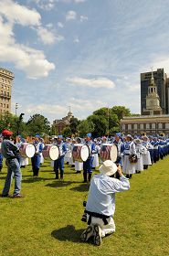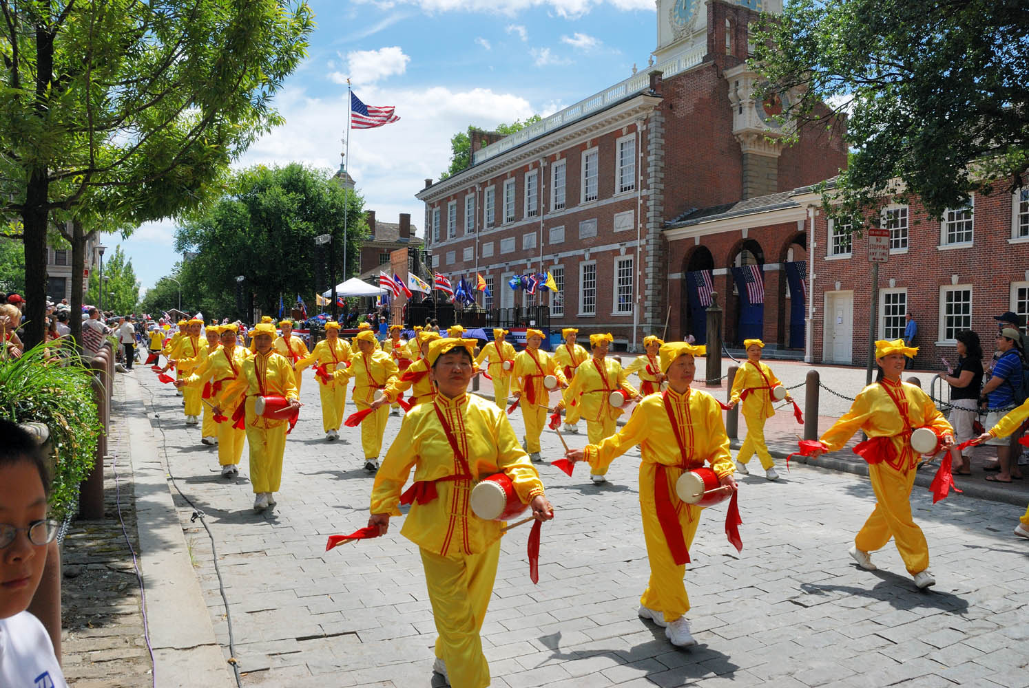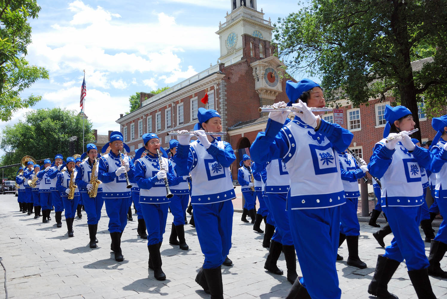 ![]() 参加费城庆祝美国二百三十三岁生日、行进在美国独立宫前的法轮功天国乐团 |