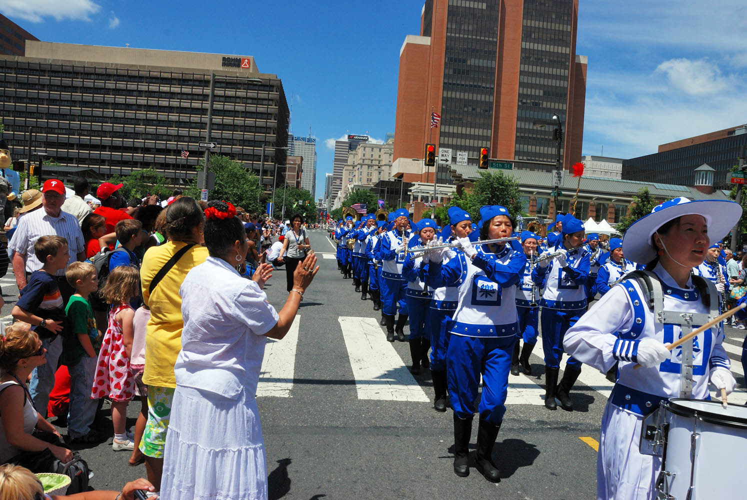 近百个来自社会各界参与游行的社团中,最引人注目的华裔队伍是由法轮功学员组成的方队,包括由一百多名法轮功学员组成的天国乐团及腰鼓队。天国乐团宝蓝色的古代乐官服与腰鼓队亮黄色的服装形成完美的视觉对比效果,腰鼓队欢快的小鼓声与天国乐团雄壮的鼓、号、釵等乐器合鸣更是震撼人的听觉。天国乐团当日演奏了《法轮大法好》、《佛恩圣乐》、《法正乾坤》等曲目,所到之处充满掌声及欢呼声。