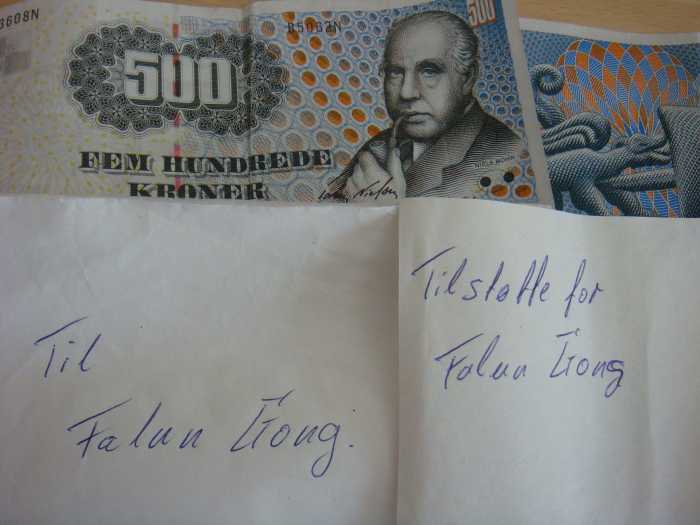 一天清晨,她象往常一样打开报箱,里边有一封信,开始以为是普通的信件,不经意打开一看,里面装着两张五百丹麦克朗面额的钞票,在一张纸上用丹麦文写着:“支持法轮功”,没有留下姓名地址或者电话号码。法轮功学员一般不接受普通民众靠工资收入以个人名义的捐助,但这位支持者以匿名方式显然希望钱被收下。看着眼前的一切,王女士很感动,她说:“一千克朗虽然不算多,但从中可以感受到它的分量。而这种发自内心的支持,给正在遭受中共迫害的法轮功学员很大的鼓励和帮助。”