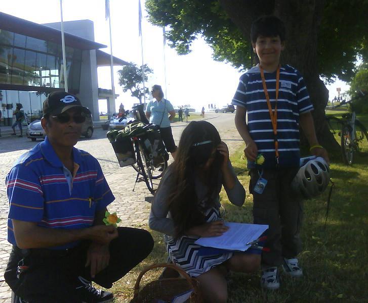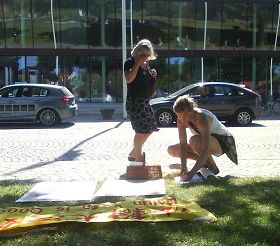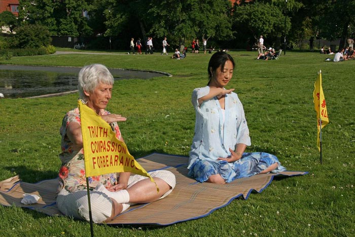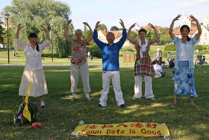 法轮功学员在维斯比市内的小公园炼功发资料。政治家周的活动场所就在风景优美的小公园附近。来小公园的也有很多游人和当地的居民。法轮功学员有的演示功法,有的发真相传单,并征集签名。很多人签名反迫害,呼吁制止中共活摘法轮功学员器官。有的人拿了真相资料后,向学员询问如何学功,有的则当场就和演示功法的学员学起来了。